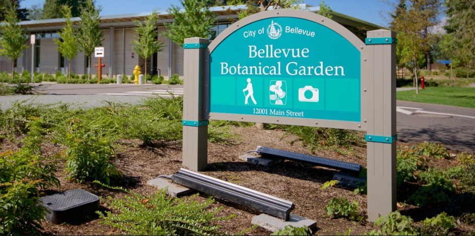 As displayed on the sign off Main Street (above), Bellevue Botanical Garden is located at 12001 Main St, Bellevue, WA 98005